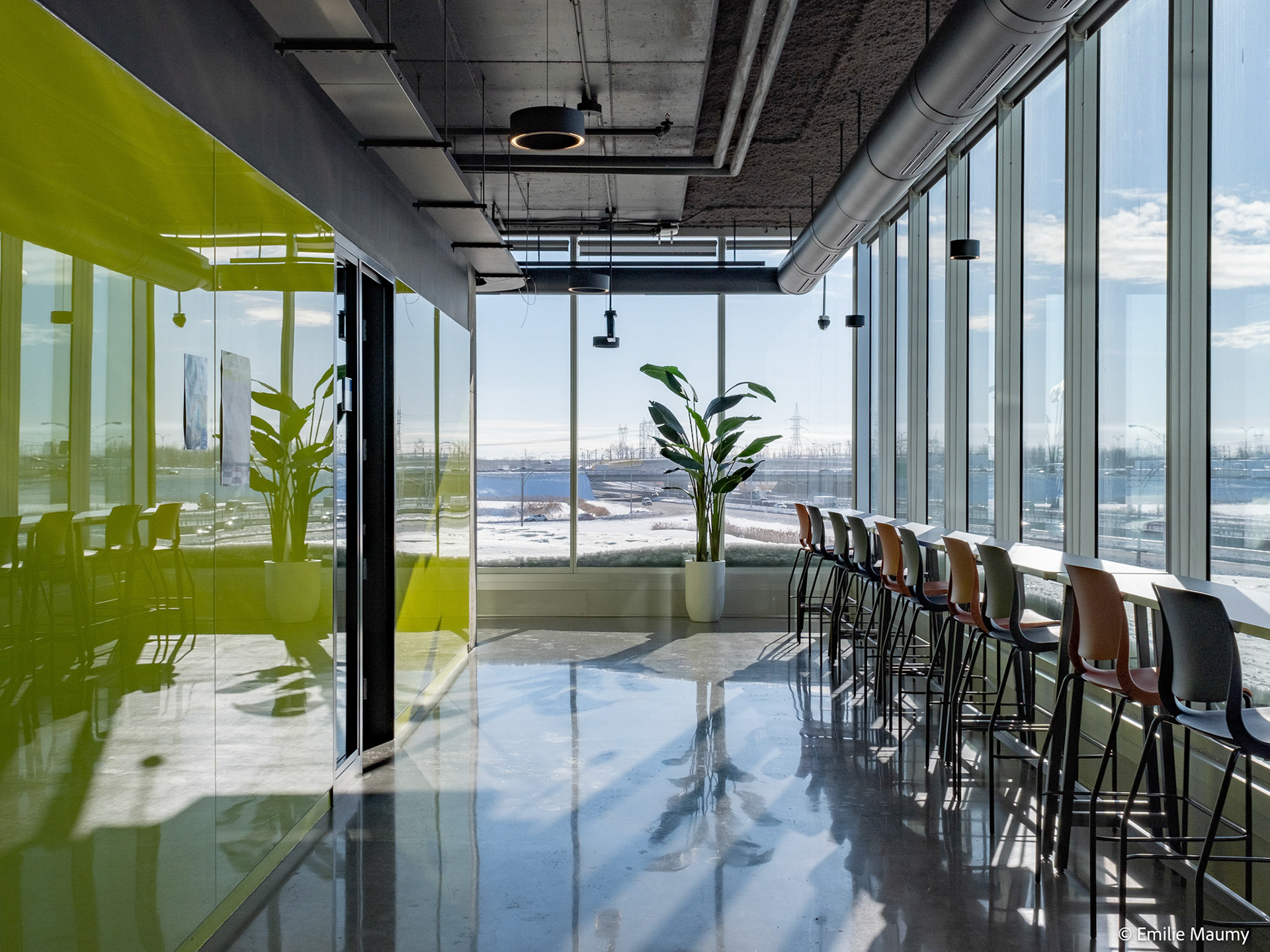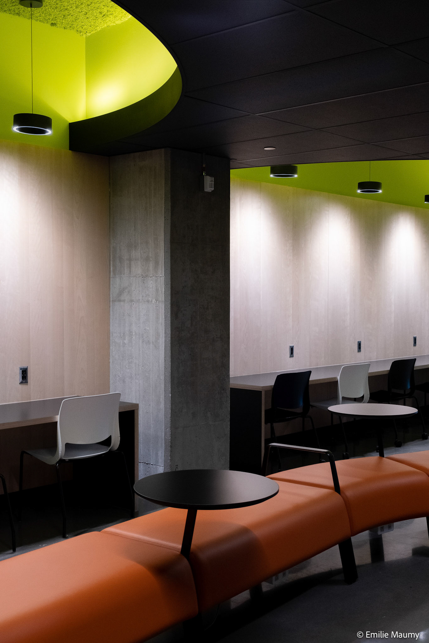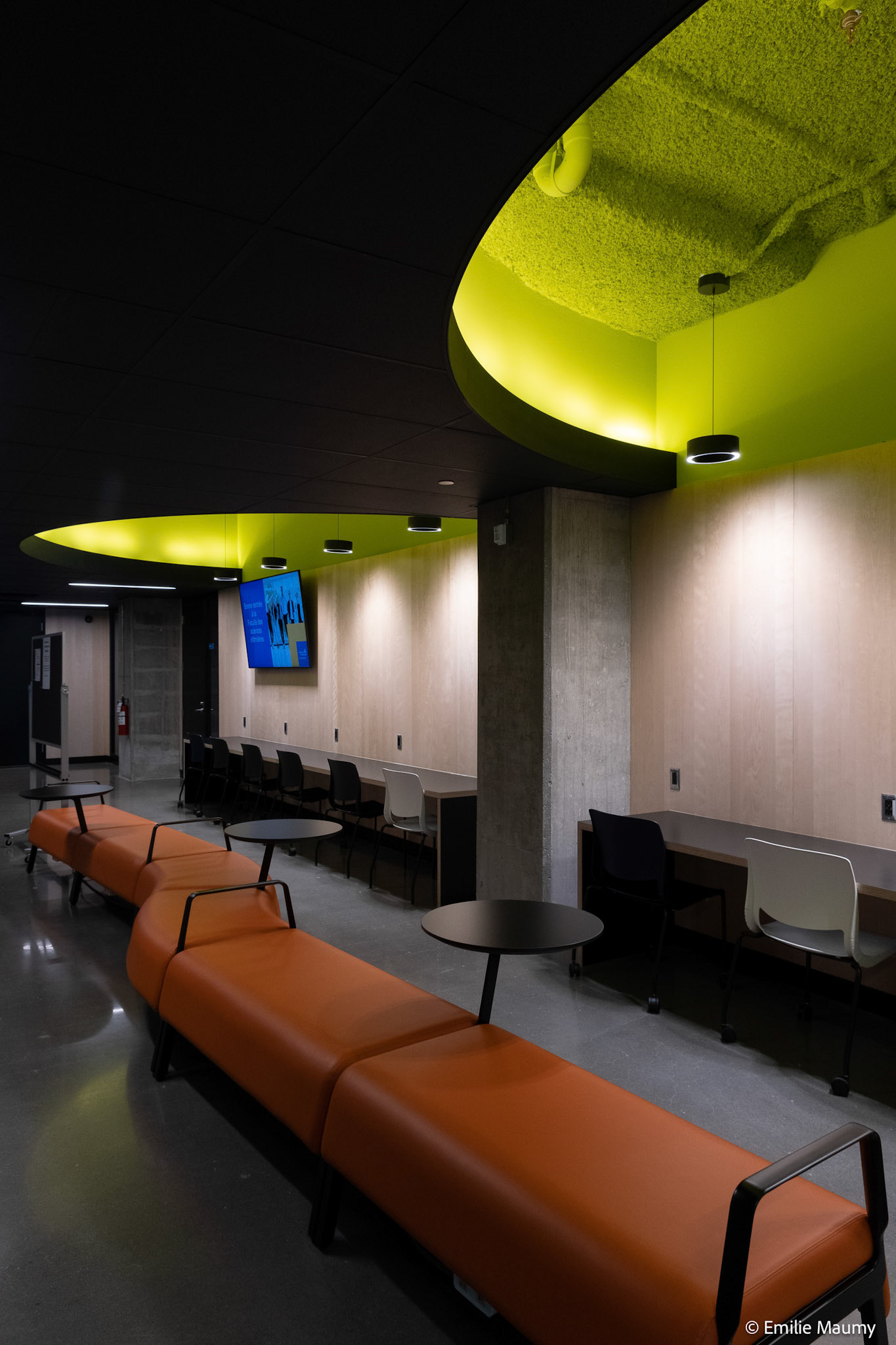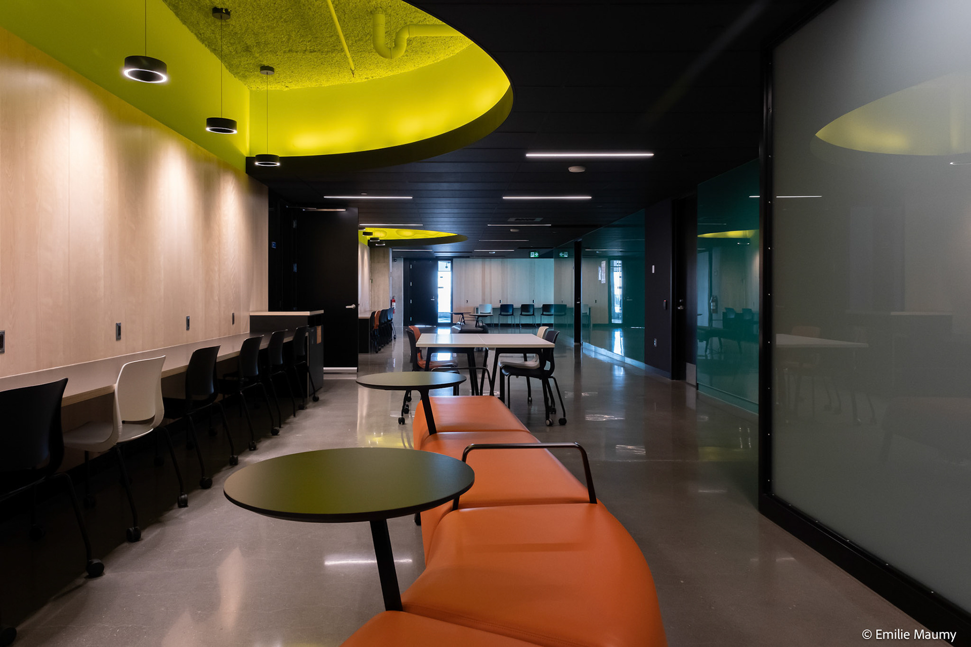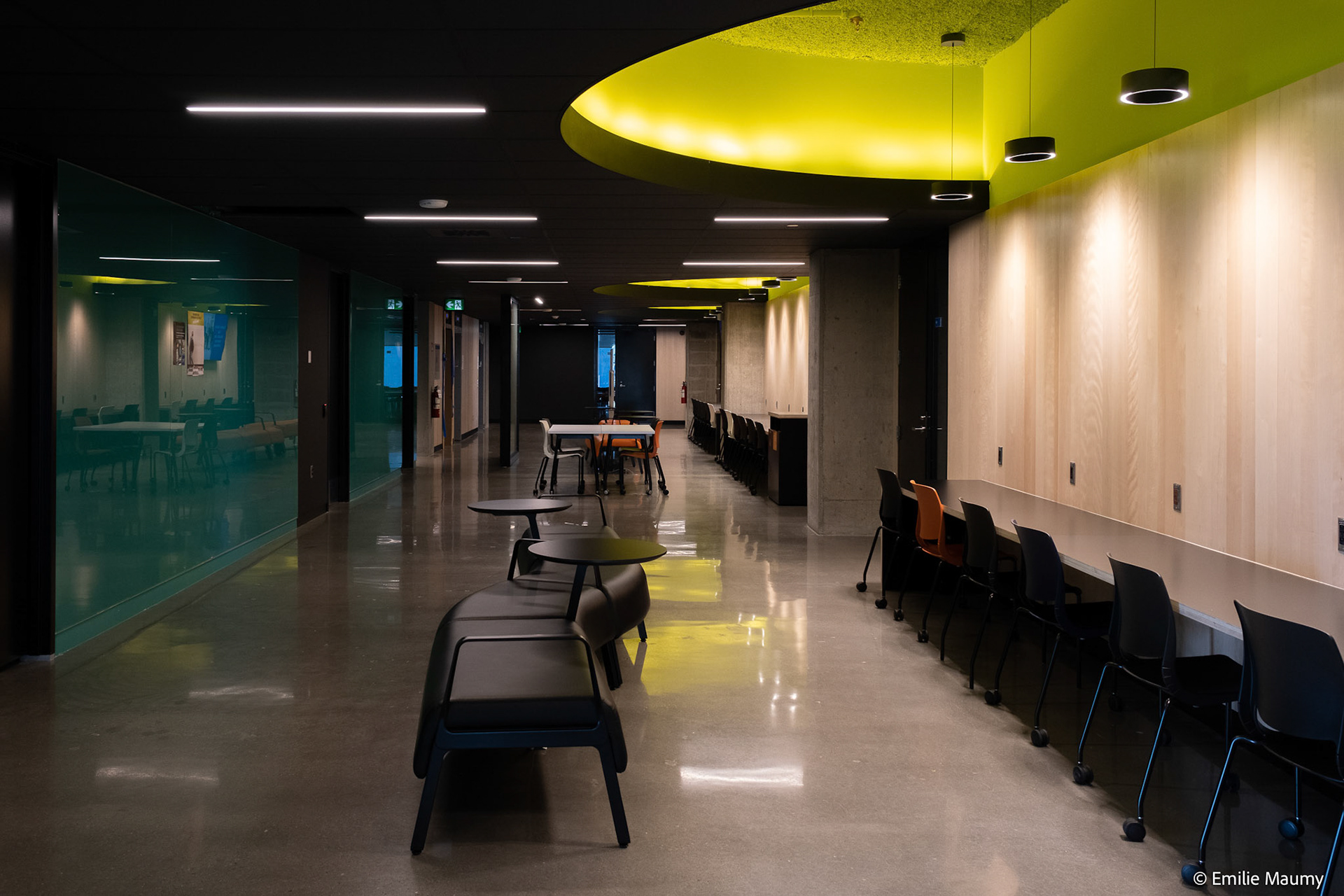 Projet d'aménagement intérieur du nouveau campus de l'université de Montréal à Brossard, conçu par le bureau d'architectes Lapointe Magne & Associés, Février 2023.